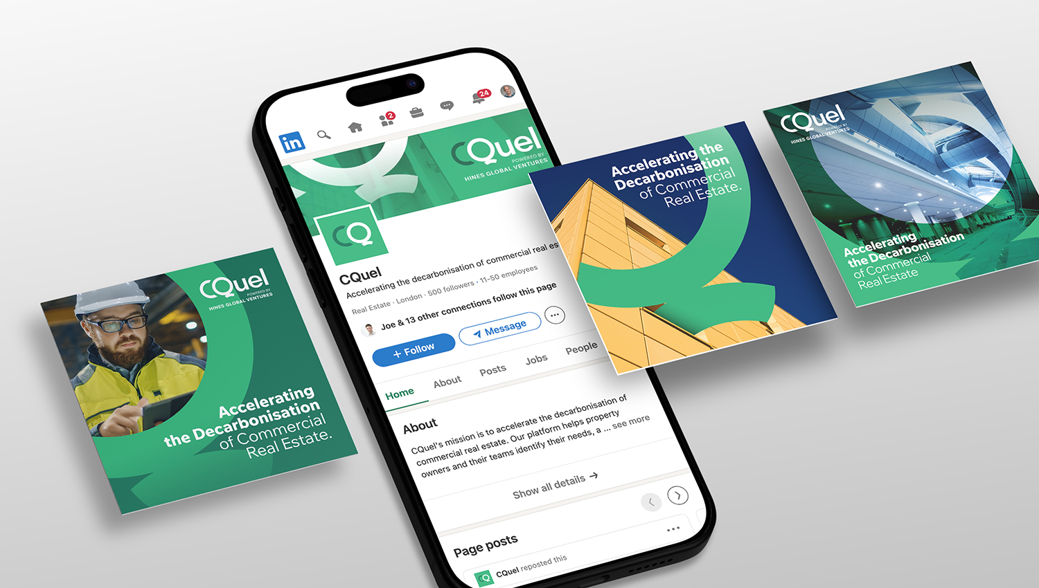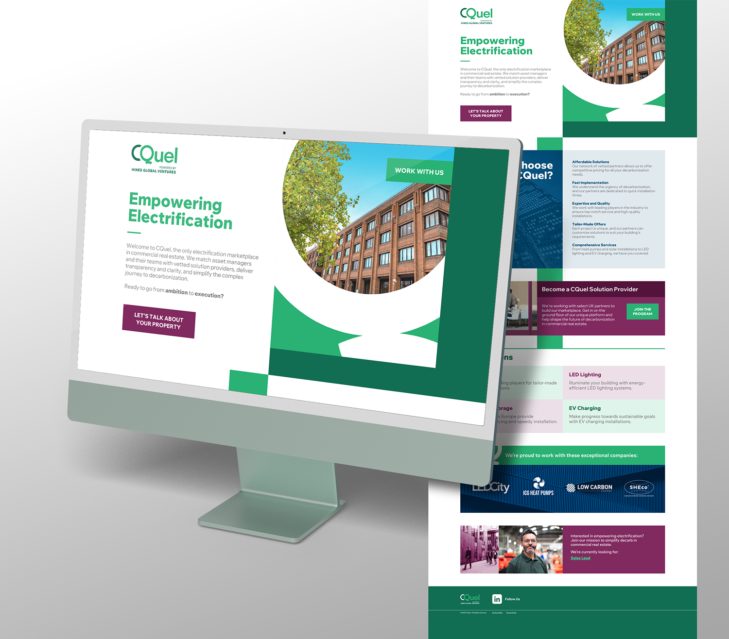I designed and developed the digital branding identity for CQuel, launched by Hines Global Ventures and based in the UK, which created a software platform to help real estate firms decarbonize all aspects of their property assets. Hines Global Ventures is the venture arm of Hines, the leading global real estate investment manager.