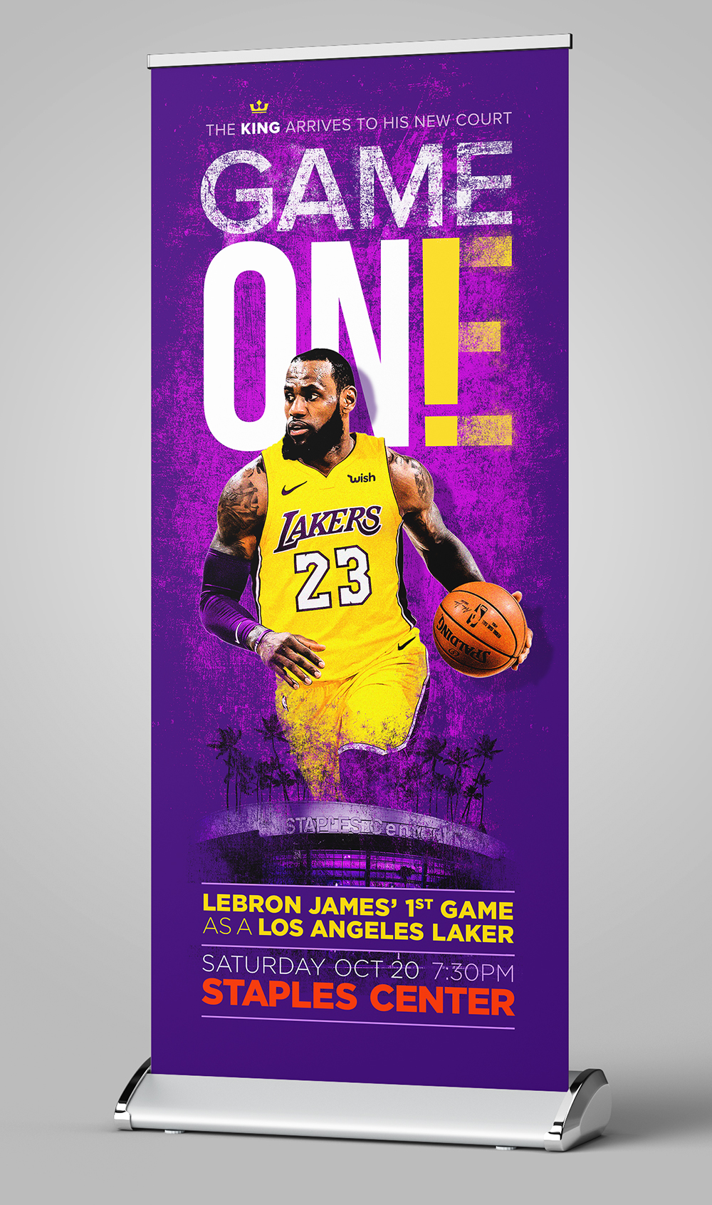 Click on image to isolate/enlarge PROJECT LeBron James GAME ON!E EXHIBITION DESIGN This banner was commissioned by the Executive team at Entertainment Partners, to be displayed just outside the company's Corporate Suite in Staples Center, and then was to be auctioned off to invitees after the game. ToolsPhotoshop, Illustrator, Acrobat Pro